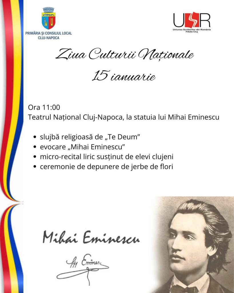 Joi, 15 Ianuarie, românii sărbătoresc Ziua Culturii Naționale și, totodată, 176 de ani de la nașterea poetului național Mihai Eminescu. Cu această ocazie, Primăria și Consiliul local Cluj-Napoca organizează un eveniment dedicat poezii și culturii.